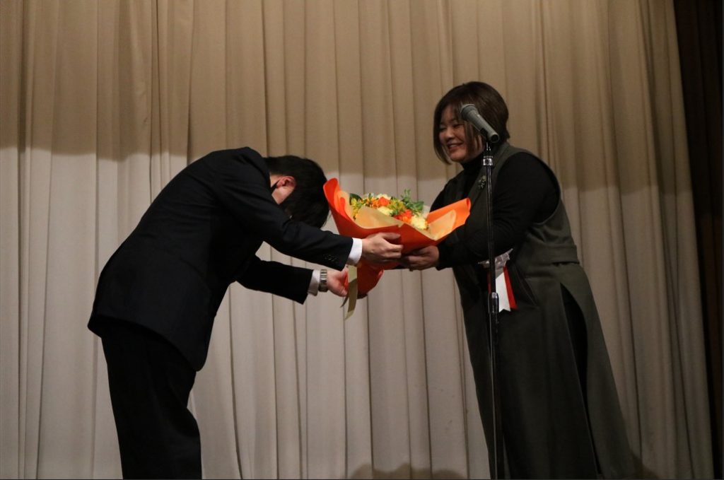 社員代表より、日ごろからの感謝の気持ちを込めて、花束を贈呈しました。社員代表を務めたのは昨年入社した最年少の我が社のHOPEです。祝賀会では率先してお手伝いを申し出てくれ、くじ引き大会のプレゼンターも務めてくれました。有難う!!!